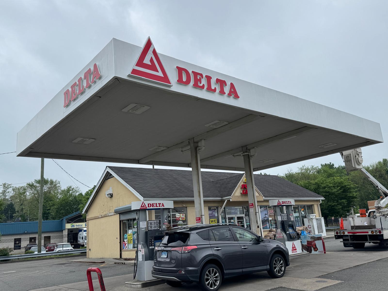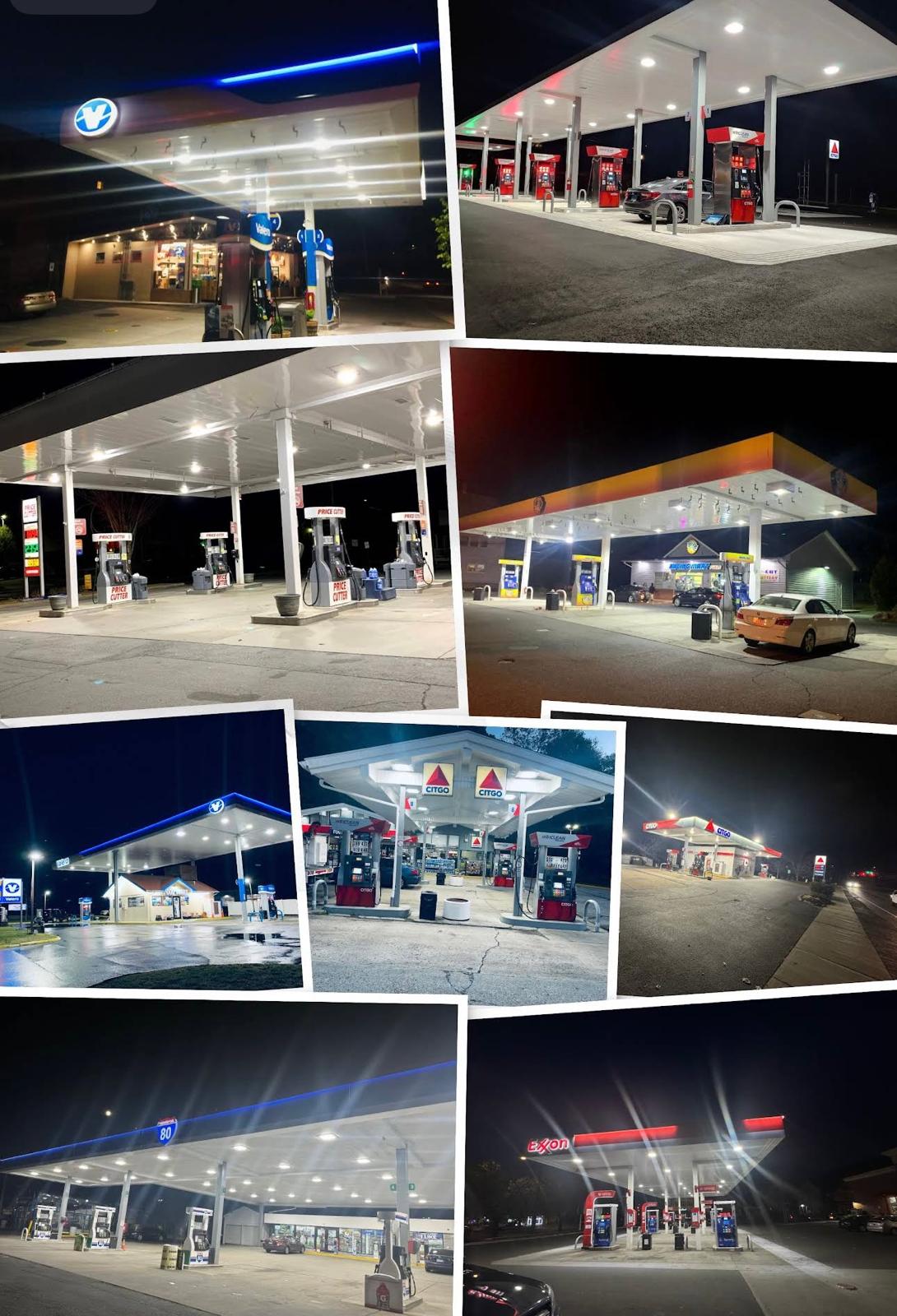 LED Gas Station Pump Toppers.Bright LED petrol pump toppers displaying fuel prices and promotional ads at a modern fuel station.